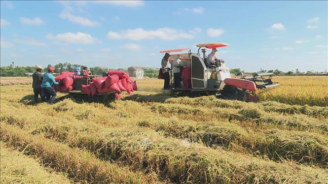 Nông dân Sóc Trăng thu hoạch lúa vụ Đông Xuân. Ảnh tư liệu: Chanh Đa/TTXVN