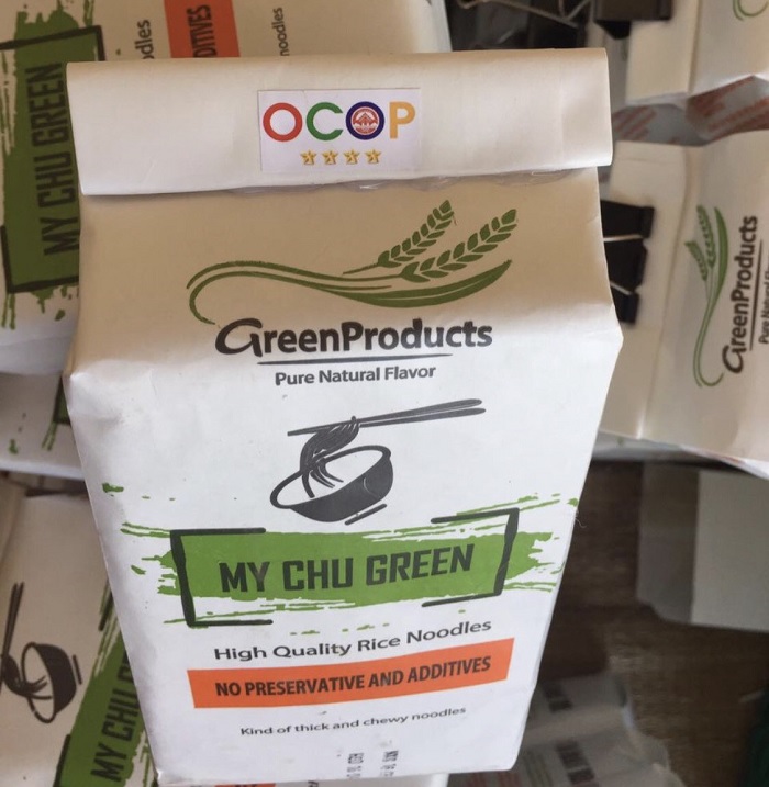 Sản phẩm OCOP 4 sao - Mỳ chũ Green trắng truyền thống làm từ gạo bao thai hồng của HTX đang được đóng góp bằng loại túi giấy kraft. Đây là loại túi giấy cao cấp nhất, đạt tiêu chí xuất khẩu và được nhập từ Nhật Bản.